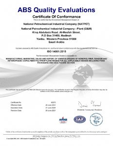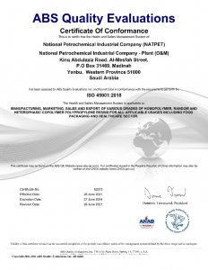 NATPET has been audited by ABS Quality Evaluation for recertification against ISO 9001:2015 Standard. Based on the result Quality Management System certification has been granted to National Petrochemical Industrial Company.