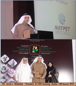 NATPET has been participating in this competition since 2010 and always recognized on the victory stand, this year NATPET is considered the best in the category of corporate social responsibility and awarded the First position in Kingdom’s Prestigious King Khalid Award – 2014 .