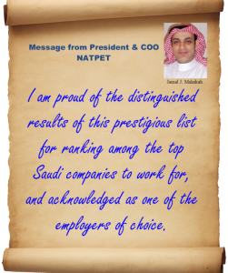 This achievement is a direct result of NATPET’s commitment in making NATPET an inspiring place to work … each and every day. NATPET expressed joy to be honored as a ‘Best Saudi Company to Work For’. The employees of NATPET have confidence in expressing it as a great place to continue their careers at, and they acknowledge that the confe rred ranking is primarily because of having a well-established NATPET approach, its culture and heritage for winning businesses.