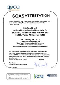 We are pleased to inform that NATPET finished goods warehouse maintained by S.A.Talkee was successfully assessed on January 24, 2017. The assessment covered the “Core” and “Warehouse Specific” elements and has been carried out using the Gulf SQAS warehouse Questionnaire and guideline. The verification was successfully completed by achieving 195/195 (100%), no improvement action plan identified. For detail please visit http://www.gulfsqas.com/certification-bodies.php